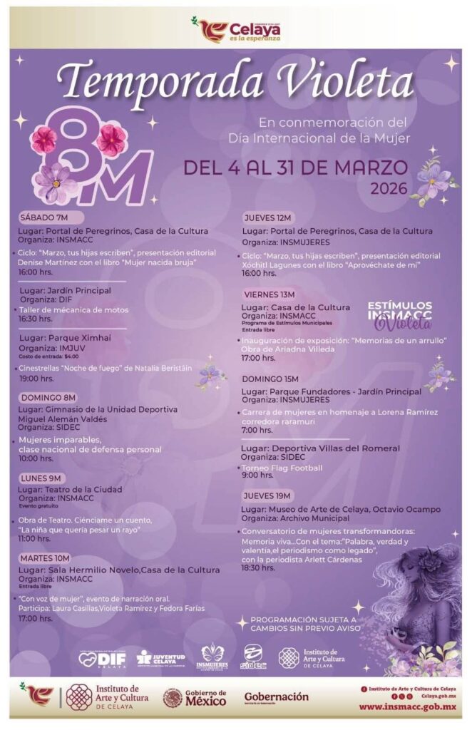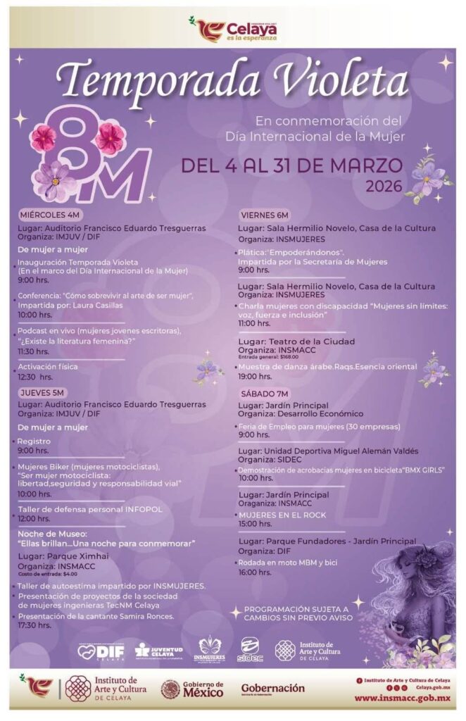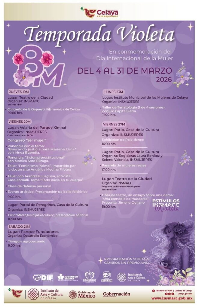 Del 4 al 31 de marzo próximos, se contará con una agenda de actividades donde se rendirá homenaje a mujeres destacadas de la comunidad, reconociendo su trayectoria, liderazgo y contribución social, a través de foros, paneles de diálogo y espacios de reflexión sobre los desafíos actuales y las oportunidades para fortalecer el liderazgo femenino en la región, así como muestras artísticas, y culturales con obras creadas por mujeres de la comunidad, dentro de un espacio para reconocer el talento, la creatividad y la sensibilidad femenina en este rubro.